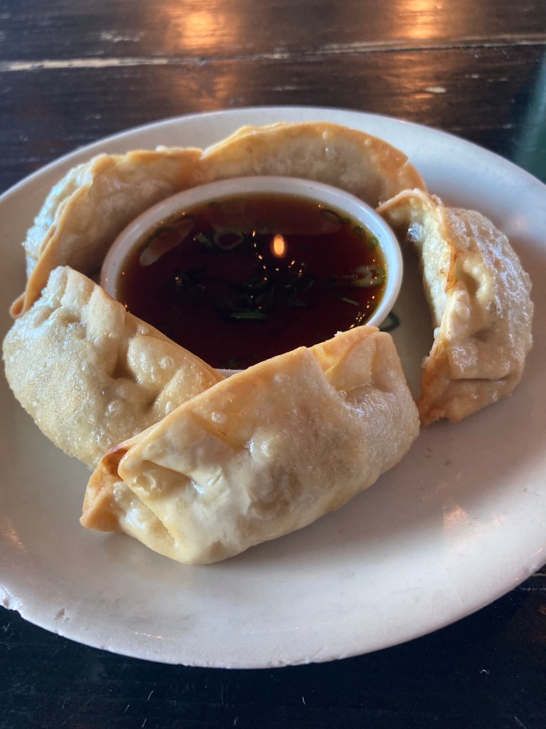 So first things first, if they offer Thai Iced Tea, I’ll order it. Now, this is tricky because Thai Iced Tea can be overly sweet, but you want it to just be sweet enough. And they nailed it! The other thing I always order is… Gyozas. Or potsticker or fried dumplings, whichever you call them. I started with the pork pot stickers, and they were good. Nothing extraordinary, but a good appetizer.