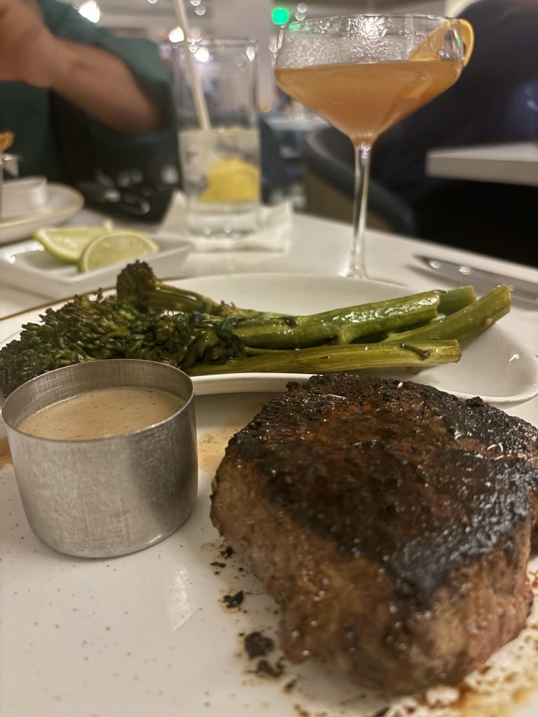 We started the meal with the Lump Crab Cakes, which were delicious. They came on some Old Bay Rémoulade, Corn Hash, and House-made Saltine Crackers, which was also delightful. It’s a decent size, just enough for my friend and I to split. Onto dinner, I got the top sirloin with broccolini as a side. The steak came with a sauce of your choice as well, I chose the Au Poivre sauce. I had asked for recommendations and was told this one was peppery, which I do like peppery. Honestly, the steak was very mid and I didn’t end up liking the sauce either. The broccolini was nothing exciting, but good.