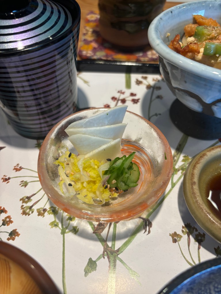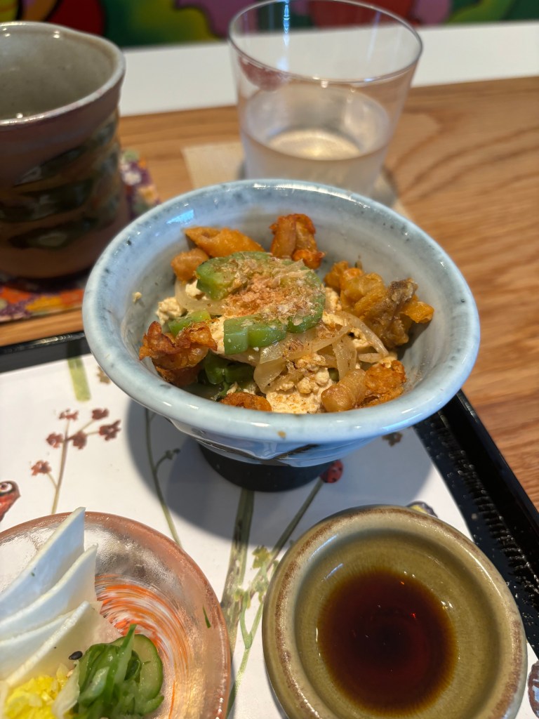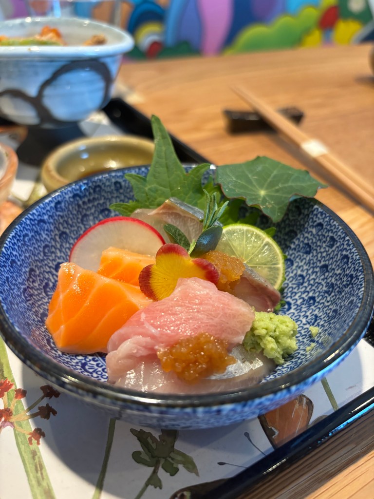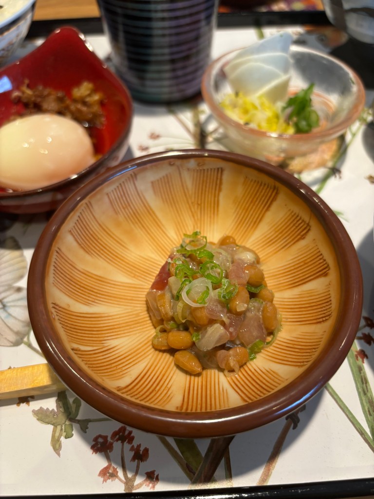 I wish there was a menu with what all the items were because I honestly forgot some things as soon as it was explained. Sometimes I have the memory of a jellyfish. One of the dishes was a mixture of things. It was interesting. There was bitter melon, I believe some kind of fried fish bites, and maybe egg? Or it could have been tofu, I’m not entirely sure. I grew up eating bitter melon, which made this feel like a very home-y meal. Another interesting item was the natto. I feel like I’ve seen it a lot in the last couple of years on social media, but I have never tried it. Definitely an acquired taste, leaning on the funky, bitter side, but I kind of liked it. They added some sashimi into the dish too which I felt was a great addition.