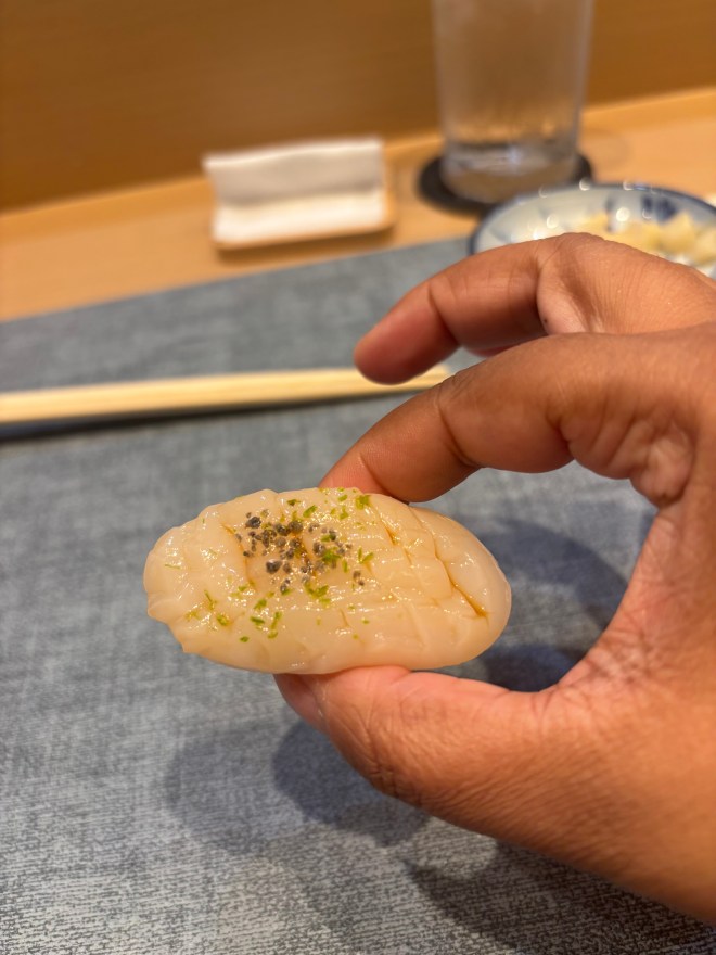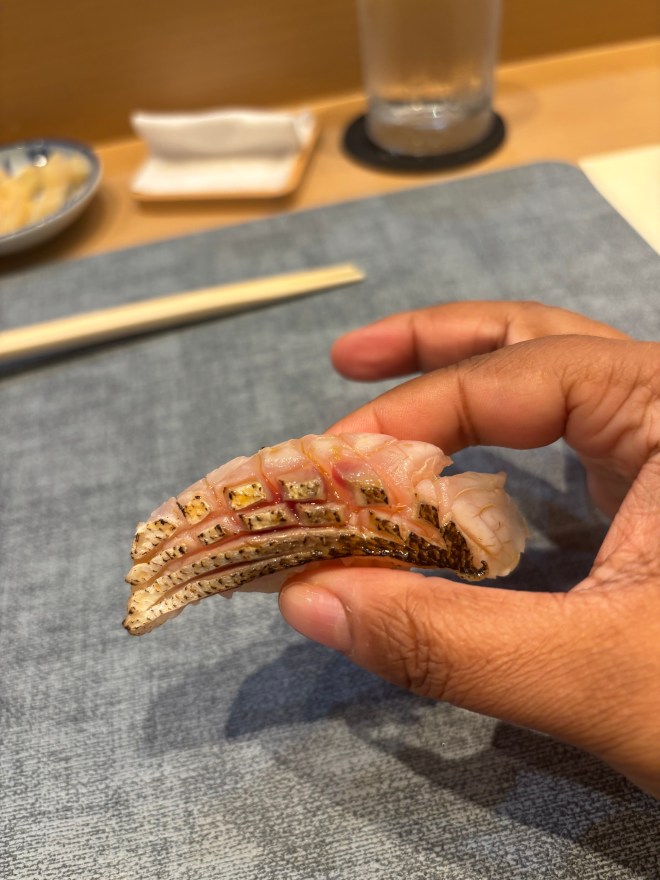 2 – Hokkaido sea scallop – the couple next to me loved this one. It remained their top bite through the night. I think the texture threw me off just a bit, because I’m used to eating scallops cooked. I’m sure I’ve had it raw in omakases before, but the delicate texture threw me a bit. It was garnished with lime zest and truffle salt, which brought it a nice bright flavor.
