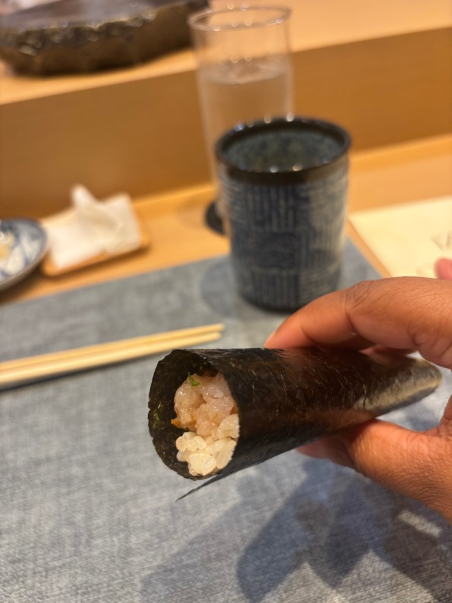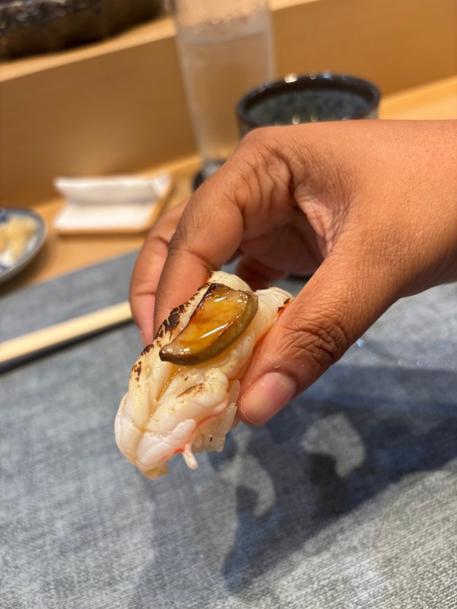5 – Fatty prawn with foie gras – This is probably going to take the top spot for me in the nigiri section. I’ve had one other instance with foie gras in Paris. Because I was in Paris, and it’s a delicacy there. It can have a rather pungent smell. And I had gotten a full pasta dish with it. The smell took over, and I simply could not. This was a small slice on top of a fatty prawn, much more palatable, and paired beautifully. It was indeed fatty, and also buttery, sweet. Decandent if you will.