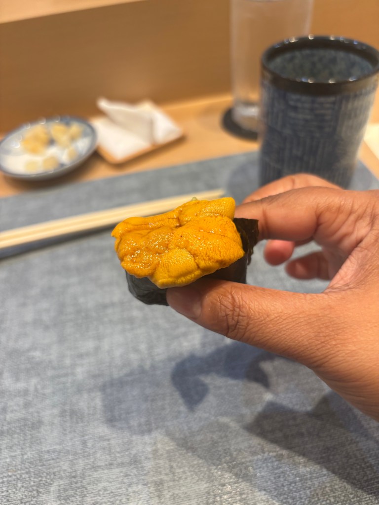 9 – Sea urchin – This flavor is definitely an acquired taste. Still not my favorite, but I don’t hate it. I do appreciate that it comes chilled, which was refreshing after the fattier pieces.