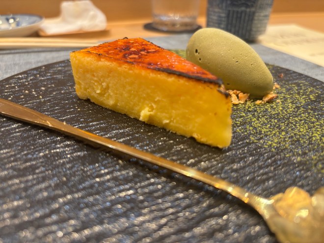 A yuzu cheesecake lightly bruleed on top with a scoop of green tea ice cream. The cheesecake was decent. I liked the light yuzu flavor, not super overpowering, but you could taste it. The brule was nice, a bit chewy as it was a very light torching. The texture was decent, not decadent, yet not light and fluffy, somewhere in the middle. I did love the green tea ice cream. I love ice cream. Give me a sundae, call it a day. But it was refreshing, and it lay on top of some salty almonds that provided the perfect crunch and contrast. I would have enjoyed just a larger portion of that side of the plate.