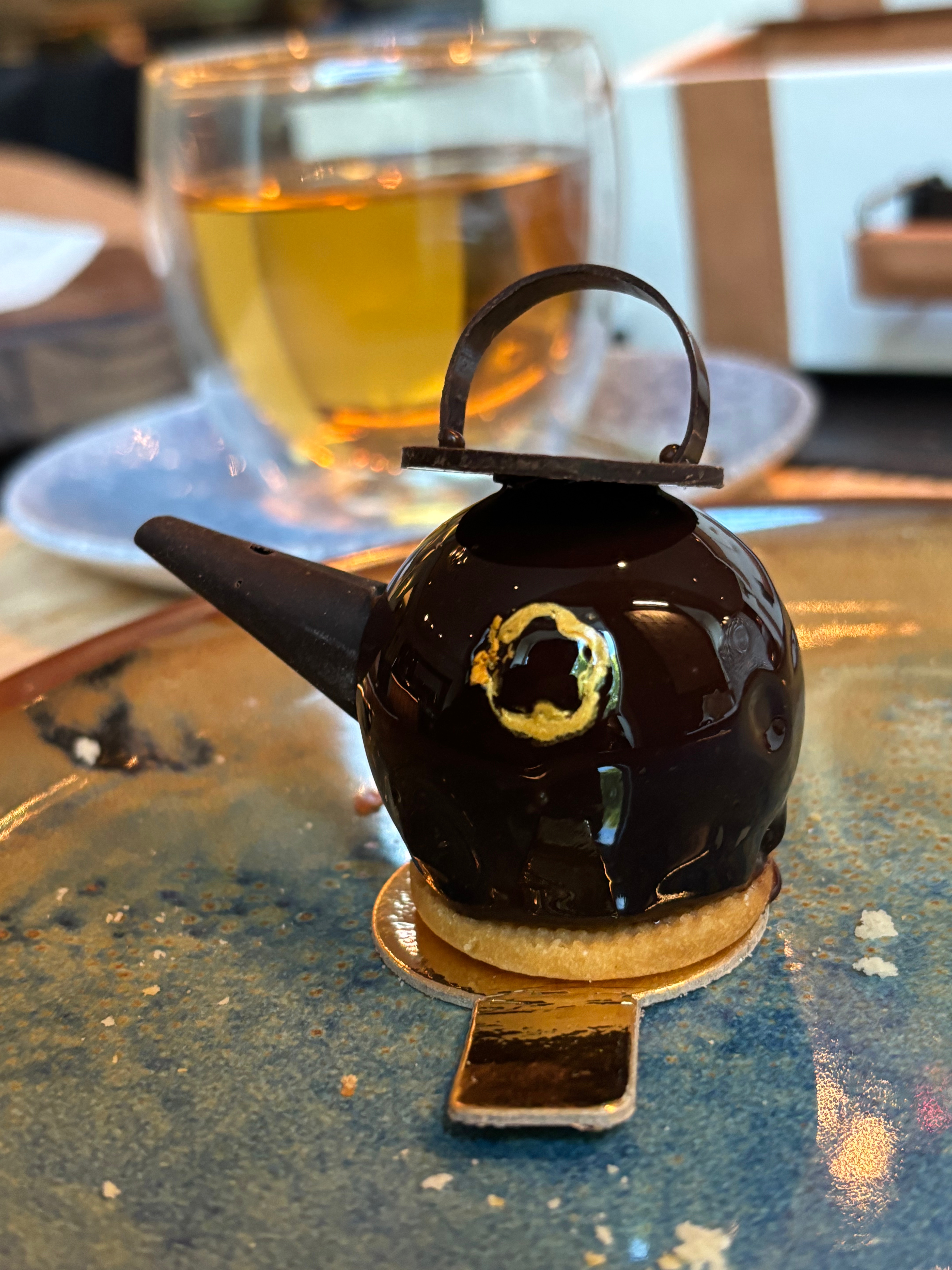 Now, I am always happy with a scone and clotted cream, and theirs did not disappoint. I love seeing a heaping bowl of clotted cream. It may clot my arteries, but I’m happy to go out that way. I started with the Lychee Snow Flowering tea, which I didn’t love, but it was an interesting new flavor I hadn’t tried before. Then I got a basic English Breakfast for the rest of my meal. I was pretty full by this point, but it was finally time for the best part, the sweet treats!